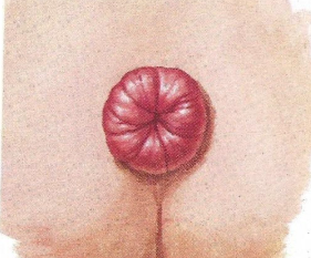 Hemorroidas prolapsadas ocorrem após a gravidez, obstipação ou diarreias crônicas e tendem a melhorar em muitos casos.